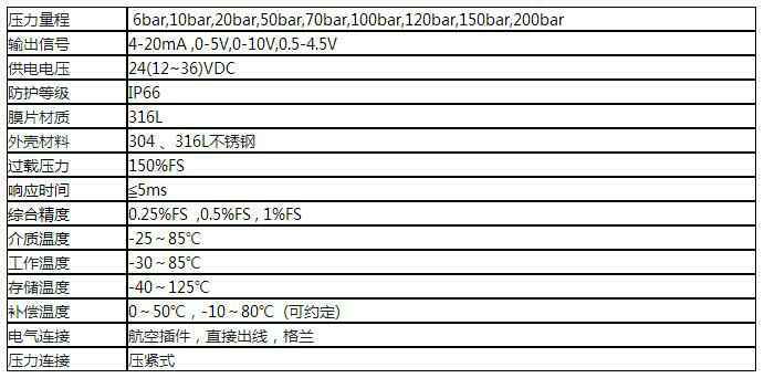 额定量程:6bar,10bar,20bar,50bar,70bar,100bar,120bar,150bar,200bar